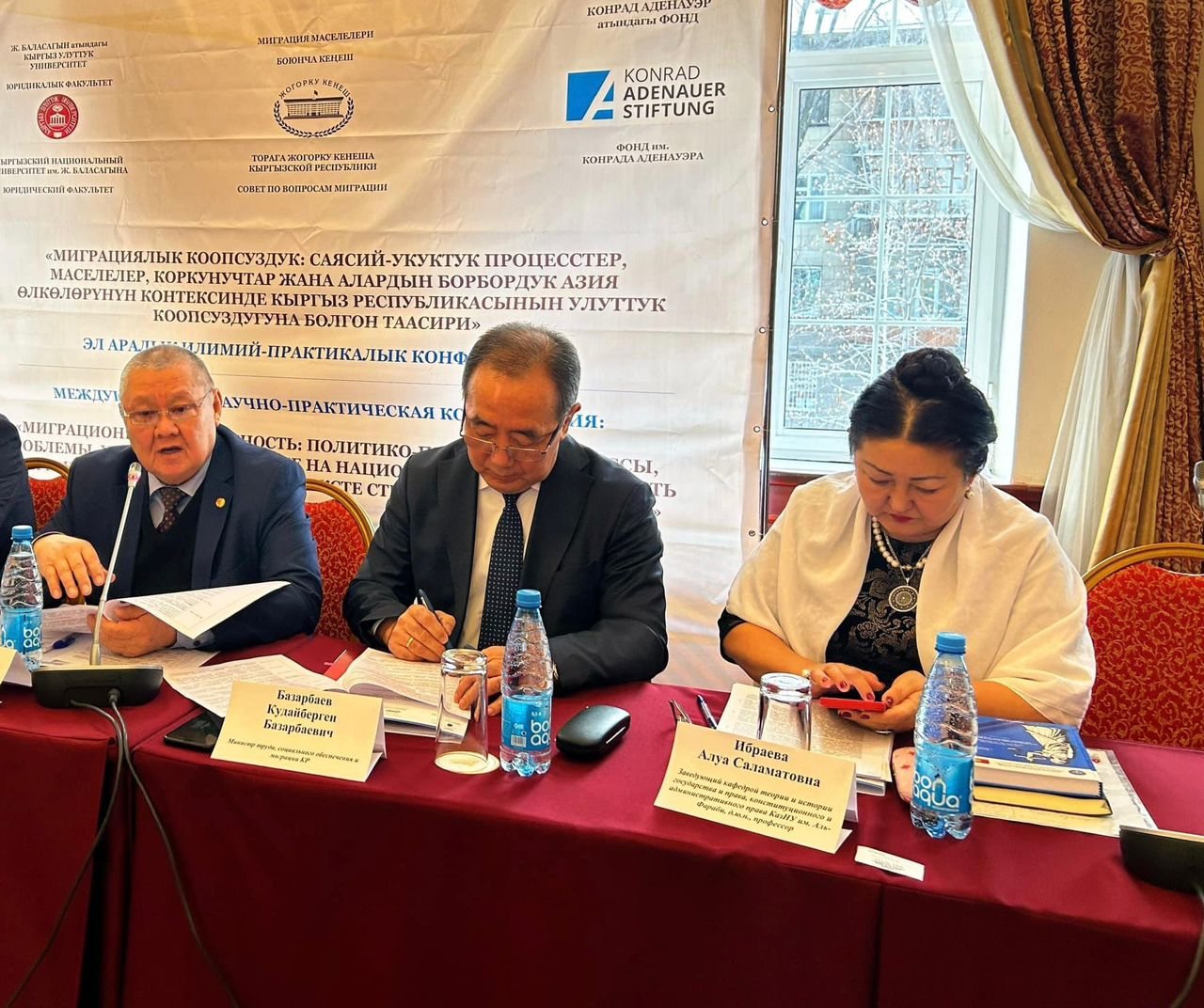 10 февраля 2023 года юридический факультет Кыргызского национального университета им. Ж. Баласагына при содействии Совета по вопросам миграции Жогорку Кенеша и Фонда им. Конрада Аденауэра была проведена Международная научно-практическая конференция на тему: «Миграционная безопасность: политико-правовые процессы, проблемы, угрозы и их влияние на национальную безопасность Кыргызской Республики в контексте стран Центральной Азии».